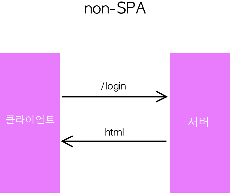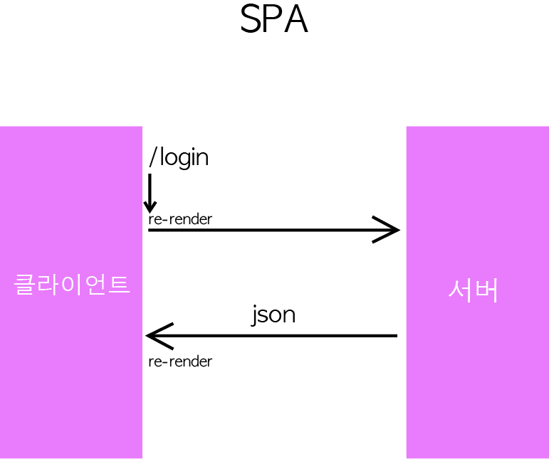 SPA에서는 어떤 주소에서 어떤 UI를 보여줄지를 클라이언트에서 결정합니다. 사용자가 페이지에 들어와서 login페이지를 들어가고 싶다면, 서버 페이지에 요청하지 않고 바로 들어갈 수 있으며, 만약에 동적인 값이 필요하다면 특정 API를 요청을 해서 특정 데이터를 json 형식으로 받아와서 보여줄 수 있습니다.